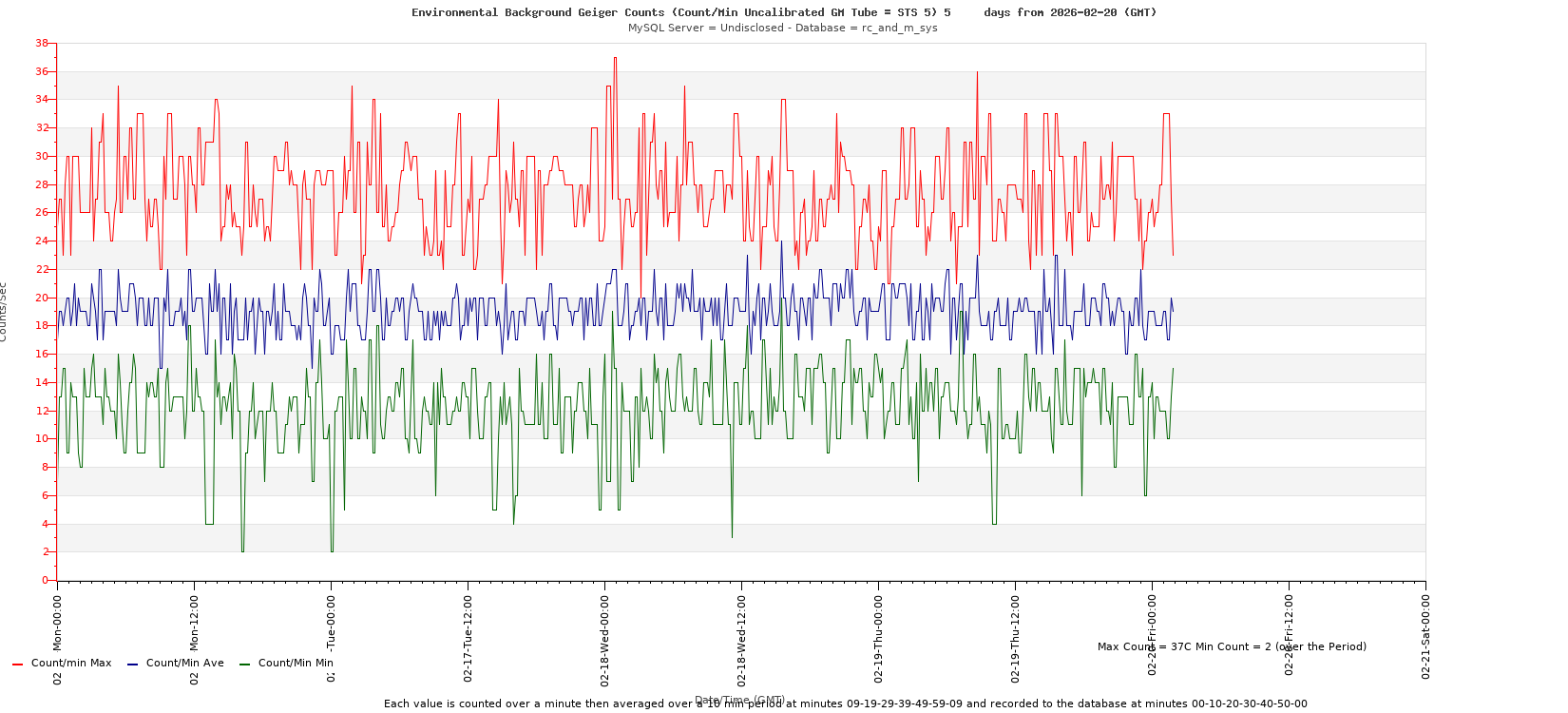 Environmental Background Geiger Counts Count/Min Uncalibrated STS 5 GM Tube 2026-02-20 Friday UTC