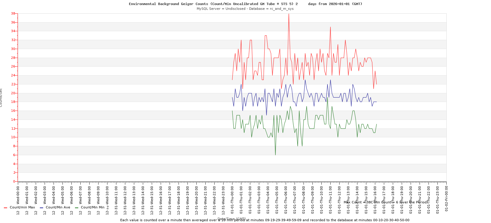 Environmental Background Geiger Counts Count/Min Uncalibrated STS 5 GM Tube 2026-01-01 Thursday UTC