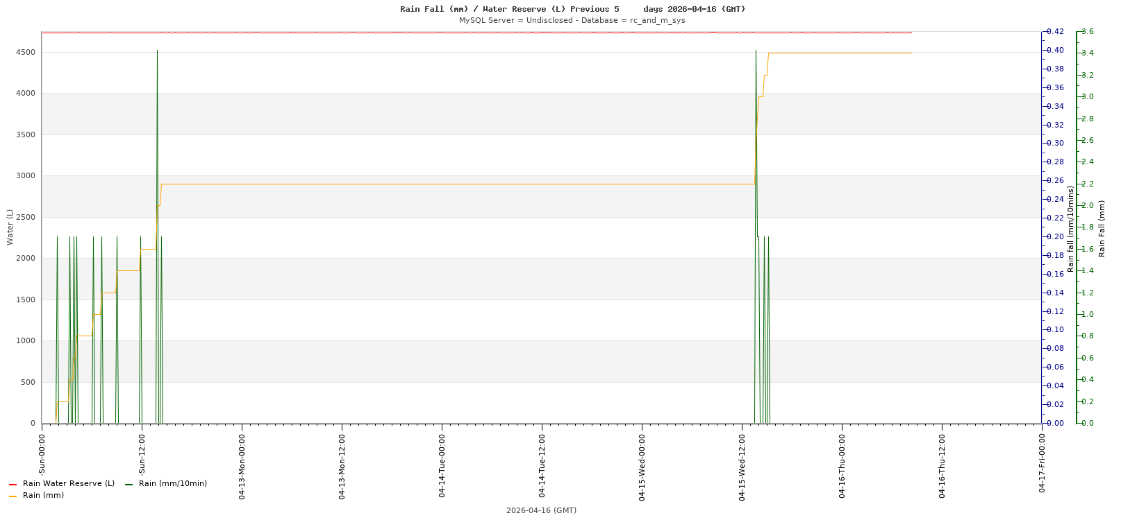 Rain Fall (mm) / Water Reserve (L) 2026-04-16 Thursday UTC