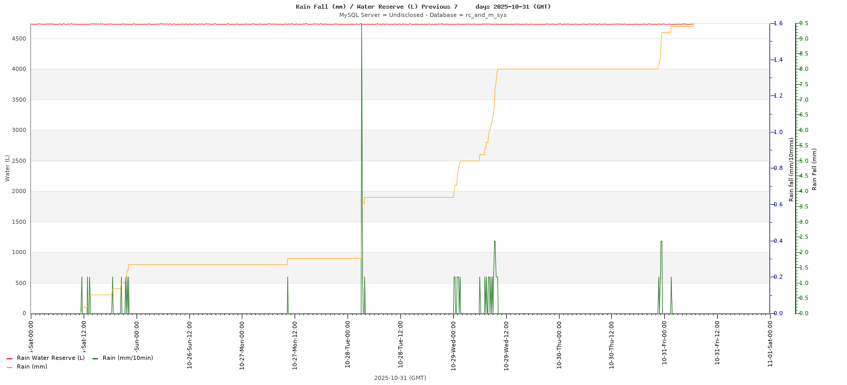 Rain Fall (mm) / Water Reserve (L) 2025-10-31 Friday UTC